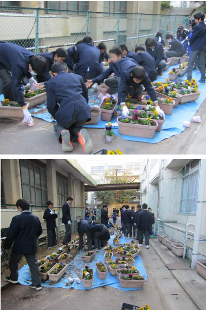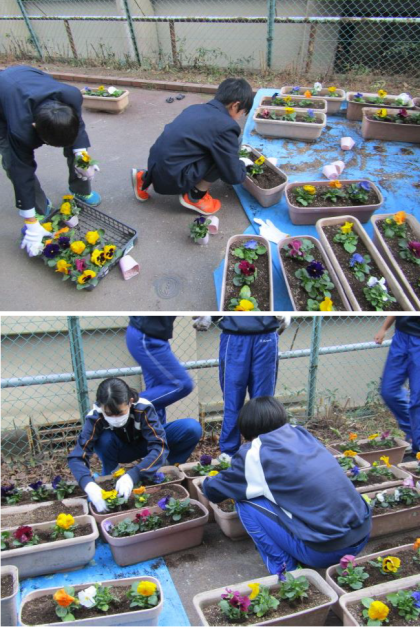 2月4日(火)の放課後,代議・専門委員会が行われ,それ以外の1・2年生の部活動に所属している生徒で校内美化に取り組むクリーンデーがありました。その活動の中で,卒業式の花道を飾るパンジー苗の植え替え作業も行われました。管理用務員さんと一緒に,ていねいに作業に取り組んでくれました。