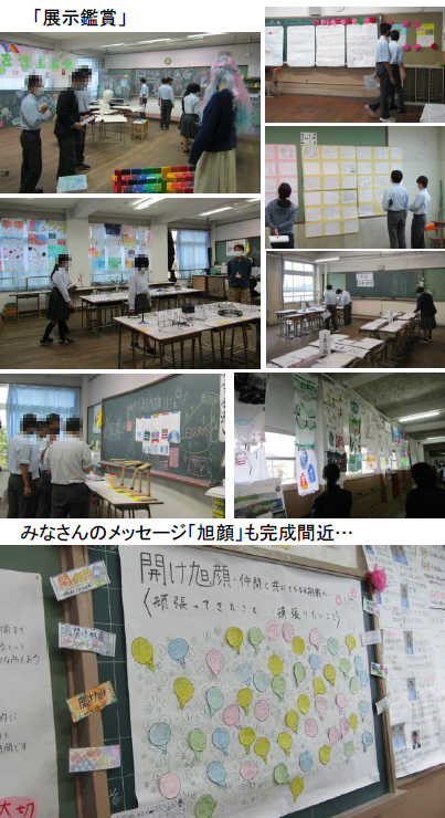 文化祭「展示鑑賞・選書会」の最後は3年生と1組の部。3年生と1組は2クラスずつ,3交代のローテーションです。3年生にとって最後の文化祭は,過去2年間とは違った形になってしまいましたが,ここまで立派に取り組んできました。3年生総合の発表も,本来予定していた修学旅行が変更になったことで,苦労も多かったと思います。お疲れ様でした!