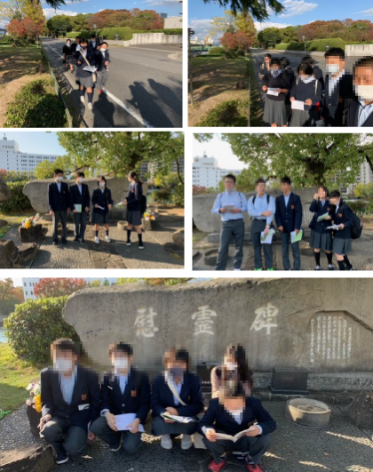 平和学習・フィールドワークでは,原爆ドーム・爆心地・広島県立第二中学校慰霊碑・峠三吉詩碑などをグループで回ります。