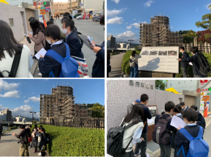 どのグループも,熱心にメモをとるなどしながら,フィールドワークでの平和学習に取り組んでいます。