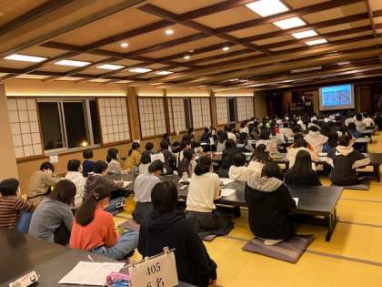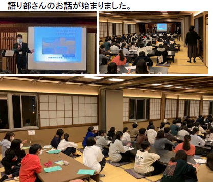 夕食が終わり,語り部さんからのお話が始りました。被爆体験を語り継ぐ伝承者の方にお話をお聞きしています。貴重なお話に,みなさん熱心に聞き入っています。