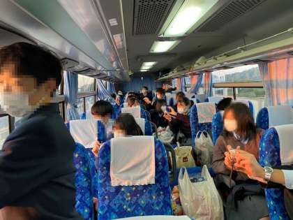 瀬戸内の夕日に歓声が!バス内は写真タイムです。