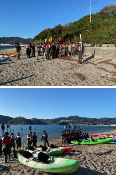 淡路じゃのひれアウトドアリゾートに到着し,いよいよ最後の活動となるアウトドア体験です。シーカヤック・SUP(スタンドアップパドルボード)・観潮船に分かれて体験します。