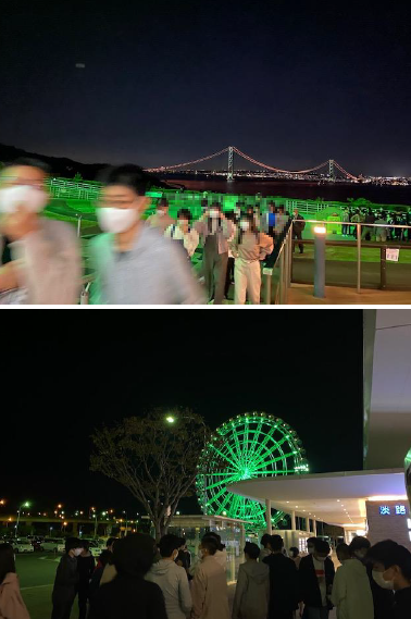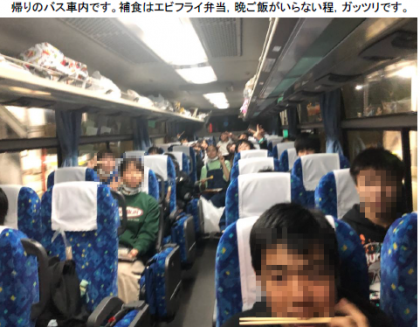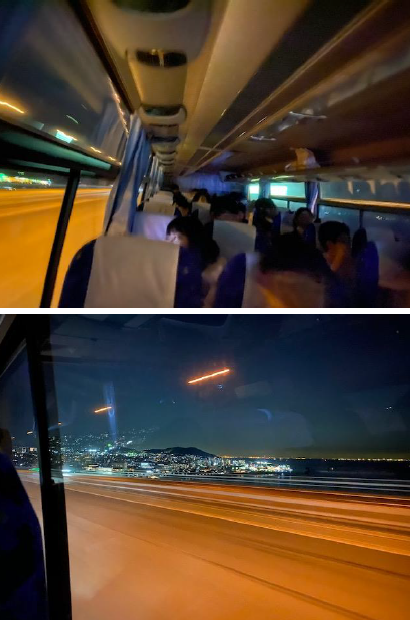 バスは,すでに淡路島SAを後にしております。明石海峡大橋を渡る時には,車内の電気を消して夜景をキレイに演出してくださいました。補食のエビフライ弁当が,思いの外,ボリュームがあり,「晩ご飯は必要ない」と言っている人もいるようです。最後の最後まで旅を満喫しています。