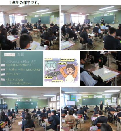 1年生は,担任の先生による道徳で,「友情」を心のテーマに「短文投稿サイトに友達の悪口を書くと」という題材で学習しました。同級生の悪口を「ネットに投稿してやる」と言い出した友人を心配し,注意できなかったこと後悔する主人公の姿から,友達とのより良い関係の築き方や,インターネットの危険性などについても知りました。友達との人間関係について,自分の生活と置き換えて考えることができたでしょうか。
