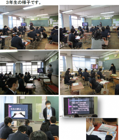 3年生は「未来予想図をえがこう」を心のテーマに,最初にイマドキの中高生へ将来の夢を聞いたインタビュー映像を視聴しました。その後,各クラス担任の先生から,中学生時代の夢や今の夢についてのお話を聞きました。その上で,今度は自分自身の「未来予想図」を考え,作ってもらいました。ひとりひとりが夢の実現に向けて,できることを考え,実行していって欲しいと願っています。