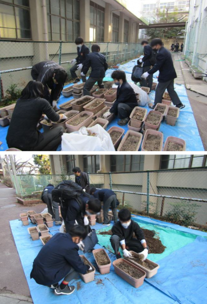 来月のクリーンデーで,卒業式に向けて校内に飾るパンジーの苗を植え付けを行う予定ですが,そのための下準備として,プランターに土を入れる作業を今日の放課後,有志のみなさんが手伝ってくれました。学校のために,黙々と作業してくれたみなさんの姿,とても素敵でした。どうもありがとう!とても助かりました!