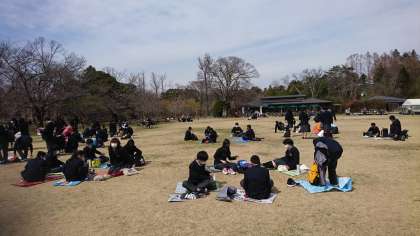 芝生の上で昼食タイム。自然に囲まれて食べる昼食は格別です!早速お昼寝タイムに入っている人も…。