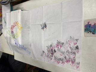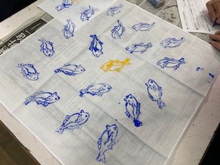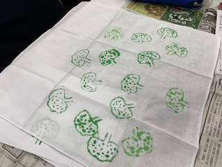 1年生の美術で,オリジナルの「消しゴムハンコ」でハンカチを制作しました。「好きなもの」や「なりたいもの」などからハンコを彫っています。アクセントやリズムなどを取り入れて構成も工夫して制作しました。