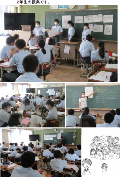 2年生は「いじめのない世界へ」を心のテーマに,「私のせいじゃない」というお話(イラスト)を見て,考えました。「イラストの女の子は何が悲しくて泣いているのだろう」ということを,まず自分で考え,グループで話し合い,意見交流しました。実は「自分は関係ない」と考えてしまう傍観者も,いじめられている人を悲しませてしまっていることに気づき,「自分に何ができるか」を考えることができたでしょうか。