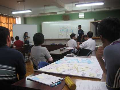 1年5組の保健体育の授業を保健体育の先生方が参観し,その後でその授業をもとにして,生徒がいきいきと活動するわかりやすい授業をどのようにして創造するかについて,4・5人のグループに分かれて話し合い,それぞれの討論の内容を発表して全員で共有しました。