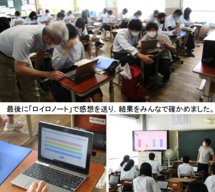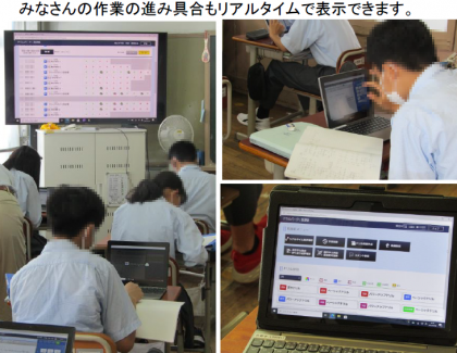 2年生の数学授業で,昨日7月1日から導入されたデジタルドリル「ミライシード」の「ドリルパーク」をGIGA端末で,早速使用してみました。個々にあった合ったレベル・ペースで演習ができるしくみになっており,自分で選んだドリルを解き進めていくと「ポイント」や「メダル」がもらえます。デジタル世代のみなさんには,ゲーム感覚で学習でき,取り組み易いようですね。最後には,使ってみた感想を,今度は「ロイロノート」で提出し,即座に映し出される分析結果をみんなで眺めました。