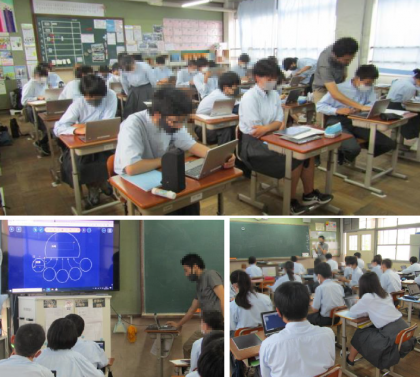 3年生の数学授業でも,GIGA端末を使用しました。3年生では,先に「ロイロノート」の使い方を学習しました。様々な資料の作成や提出・仲間との共有などの操作が簡単にできることや,シンキングツールなどを用いた学習にも使えることなどを知りました。その後,ミライシードの「ドリルパーク」で実際に演習を行いました。中学3年生の問題だけでなく,1・2年生の課題を演習することもでき,受験生である3年生にとって,苦手分野の復習にも使えそうなことがわかりました。