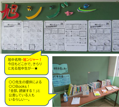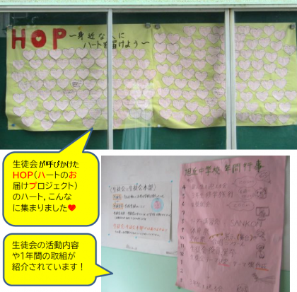 校内を歩いていると,いたるところに旭中生の日々の頑張りの一面が掲示されています。お家の方にも13日からの懇談でご来校の際に,ぜひご覧いただければと思います。