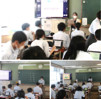昨日と今日の2日間,3年生「理科」で校内公開授業がありました。「生物」分野ですでに学習した内容(遺伝・進化・生態系など)に関して,自分の興味のあることについて「問い」を立てて,それらを解決するために調べ学習を行いました。今回は,それをロイロノートを用いて発表する授業でした。,専門的で高度な内容に,さすが3年生と感心しました。