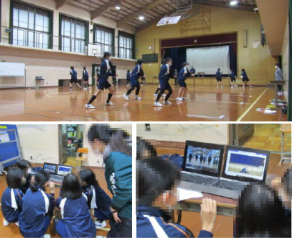 先日の「ダンス講習会」で学んだステップをグループで練習し,「正しいステップをリズムに合わせて踊ることができるようになること」が今日の目標でした。タブレットを用いてプロのダンサーの動画を見たり,自分たちの踊っている姿を動画に撮って見比べたりしながら,難しい動きもグループで教え合いながら練習できていました。仲間と協力し合うことで,ダンスの「リズムに乗って全身で踊る楽しさ」を味わえると良いですね!