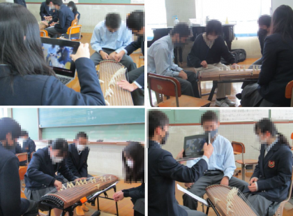 今週は,全学年の音楽科の授業で校内公開授業が行われています。今回の授業のめあては,「唱歌(しょうが)を大切に,箏(こと)で『さくら』を演奏する」ことです。今日の3年生の授業では,グループごとに唱歌を歌ったり,タブレットで演奏している姿を撮影し合ったりしながら,協力して熱心に活動できており,みなさん2回目の授業とは思えないほど上達していました。自分で箏を演奏するという日ごろあまり経験できない機会に,とても意欲的に取り組んでいました。