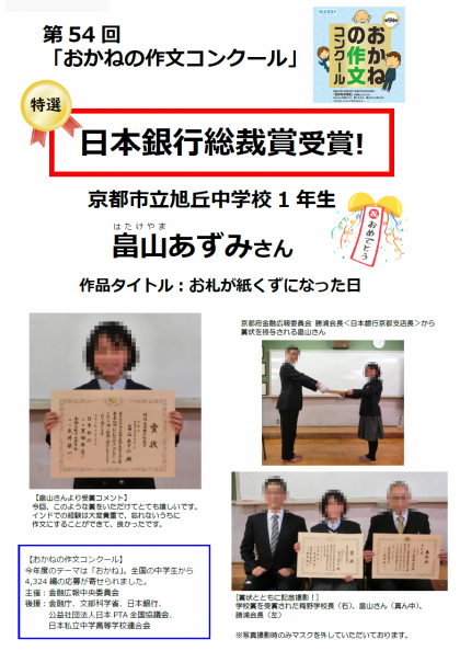 今年度行なわれた「第54回お金の作文コンクール」で,本校1年生の畠山あずみさんが見事,「特選・日本銀行総裁賞」に選ばれ,先日関係者の方々が旭中にお越し下さり,「表彰式」が行なわれました。