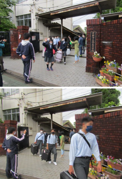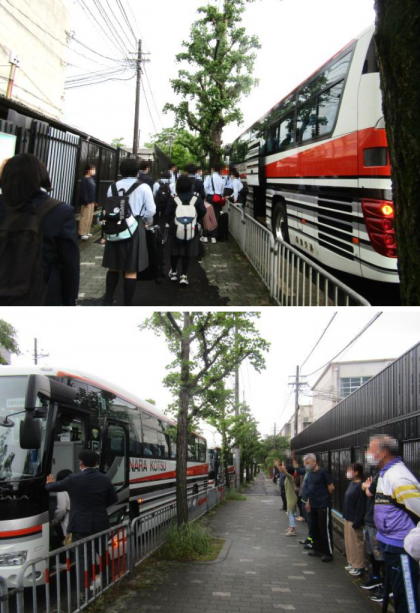 今日5月14日(土),昨夜からの雨も止み,無事修学旅行の朝を迎えました。6時15分には集合完了し,6時半からバスに乗り込みました。たくさんの教職員,家族の方に見送られ,予定通り出発です。3日間,安全に気をつけて楽しんで来て下さい!いってらっしゃい!