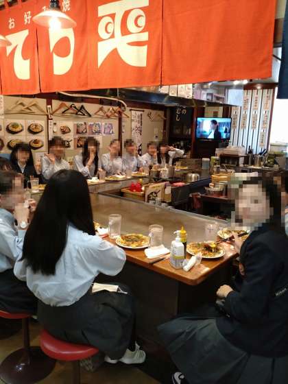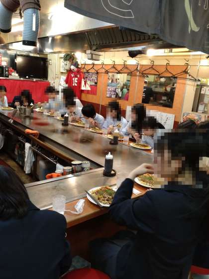 バスは,無事広島に到着。「ひろしまお好み広場」にて昼食です。予定より少し早いですが,おいしいお好み焼きをほおばっています!みなさん,きちんと「黙食」を守ってくれています。