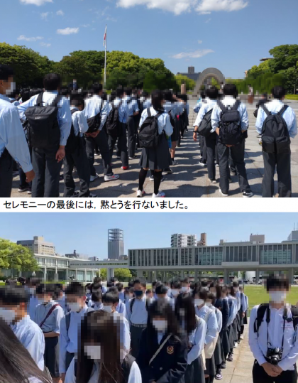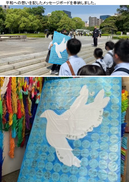 平和公園に到着し,最初に「平和セレモニー」を行ないました。平和への誓いと,みなさんの平和への想いを記した「平和メッセージボード」を奉納しました。最後に黙とうをし,戦争で犠牲になった方々へのご冥福をお祈りするとともに,平和の尊さを噛みしめ,誓いを新たにしました。
