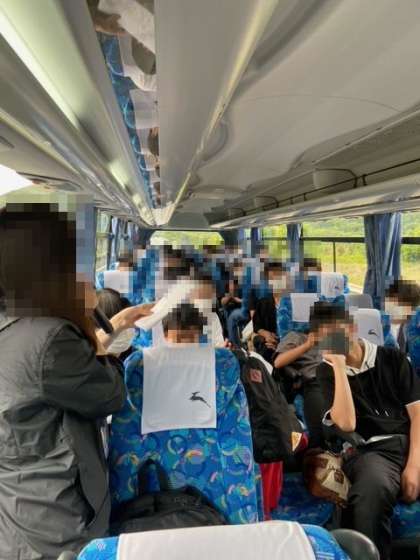 バスはまもなく「鷲羽山ハイランド」に到着します。バス車内で諸注意等の説明を受けています。さぁみんな,起きや〜!!