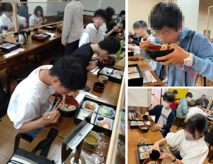 うどん学校に着き、まずは腹ごしらえから。ぶっかけに戸惑う生徒もいたようですが、本場のうどんの味はいかがですか?