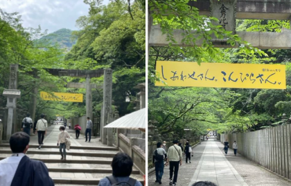 うどん体験を終え,金比羅登山が始まりました。長い石段を登っていきます。天気が良くなってきて,汗をかきそうです!