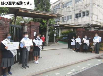 10月6日(木)、先日までの暑さがウソのような「肌寒さ」さえ感じる朝ですが、昨日から始まった選挙活動として、登校時には正門で候補者がみなさんを出迎え、挨拶と自己PRを頑張っています!