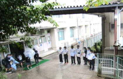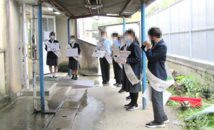 10月7日(金)、朝からの雨のため、登校時の「選挙活動」も急きょ「雨バージョン」に。2箇所に分かれて渡り廊下でPR活動です。雨ニモ負ケズ、頑張れ候補者達!!