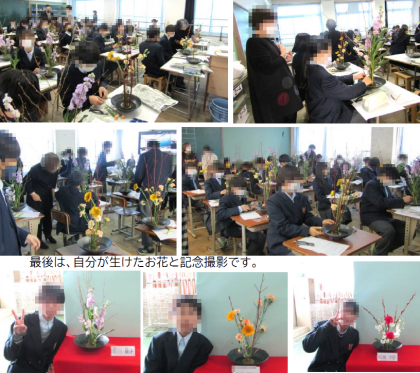 今日12月2日(金)、1年生で伝統文化体験「華道・いけばな教室」がありました。今年度から京都市の中学校で全校実施されることになり、旭丘中学校としては初の取組です。華道の家元さんやアシスタントの方々が講師としてお越し下さり、直々に指導をしていただきました。最初は戸惑い気味だった人も、生けているうちにすっかり夢中になり、最後には全員が立派な自分の「いけばな」作品を完成させました。