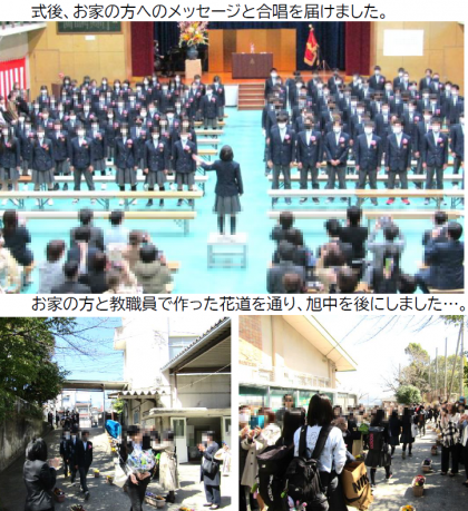 在校生の代表としてたった一人で式に参列してくれた2年生の挨拶は、3年生への感謝の気持ちにあふれ、3年生からの答辞では、入学してすぐの休校措置に始まり、様々な制約でつらい思いをしながらも仲間と巡り合え、共に過ごせた大切な日々への想いが伝わってきました。証書を受け取る時の態度、式歌「旅立ちの歌」、式後のお家の方へのメッセージと合唱「正解」、すべてが立派で心に響くものがありました。
