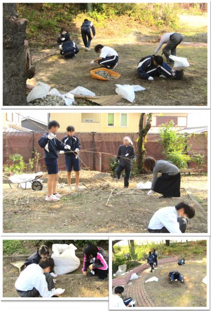 本日は、かがやく丘の整備です。雑草を抜いたり枯れ枝を片付けたりと、用務員さんやスクールカウンセラーの先生たちにも手伝ってもらいました。