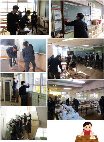 2学期最終日。みんなで大掃除を行いました。みんなで校内各所を隅々まできれいにしました。終業式後は油引きも行い、新年を迎える準備も万全です。