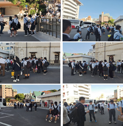 長崎市内班別研修を終え、松ヶ枝町駐車場に集合しています。