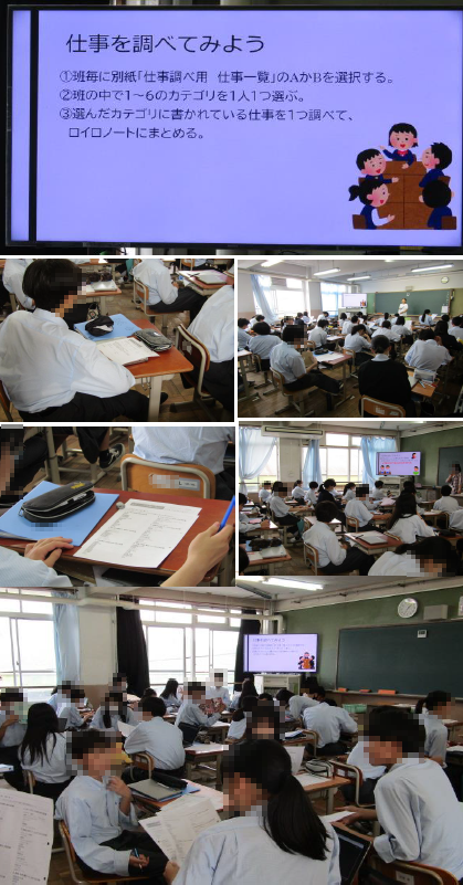 事前に各種の職業について調べ、体験する職業について考えていきます。