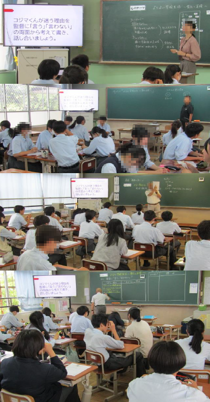 今週の3年生の道徳では、心のテーマを「よりよい学校生活 〜責任と友情〜」として行いました。陸上部最後の大会で、リレーメンバーの一人がけがをしていることが分かりました。けがをしている本人は監督にそのことを隠して出場しようとします。キャプテンはこのまま隠し通すべきか、監督に報告すべきか、困ってしまいます。