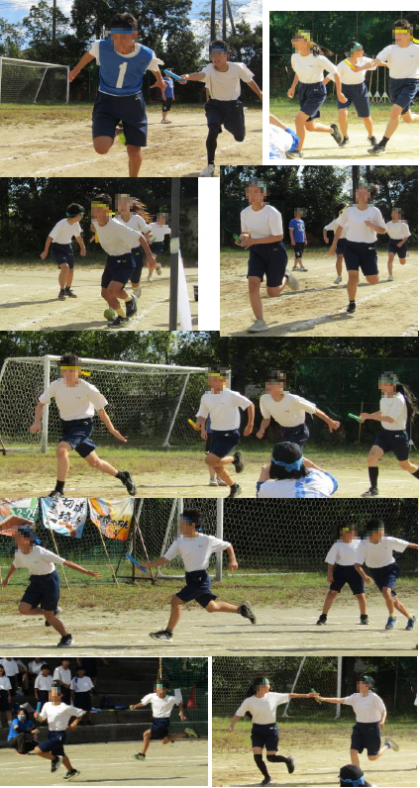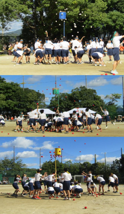 上から順に、玉入れ、色別対抗リレー、大縄跳び、大玉運び です。