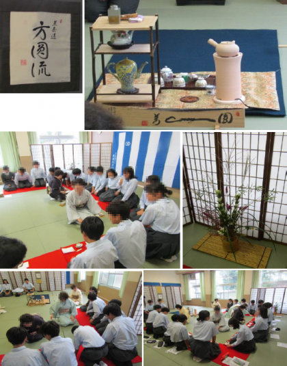 展示発表と同日に、茶道体験を行いました。煎茶道法円流の皆様に教えていただいています。
