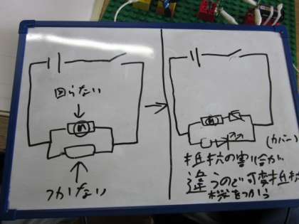 ●PART2⇒等価回路に挑戦。ここのポイントは並列での回路条件を同じにすると、同じように電気が流れる現象を確認します。モータとLEDランプを並列に接続すると、モータは回っても、LEDはほとんど点灯しません。理由はほとんどの電流が負荷の軽いモータに流れるためです。授業では実験で確かめて,ホワイトボードに電気回路図を描いて話し合ったことをもとに、それぞれのワークシートで情報共有をします。この実習のポイントは、予想や理論を実践することで確証に変わり、抵抗の違いによって電気の流れ方が変わる事が理解できます。