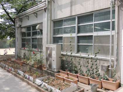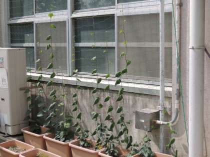 今年は「緑のカーテン」として朝顔を栽培しています。こちらも、つるが伸びてきています。夏には緑いっぱいになって、少しでもエコになればいいですね。
