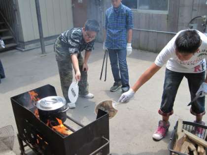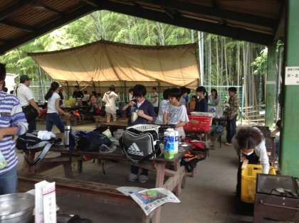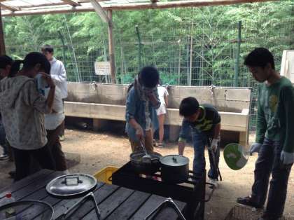 「友愛の丘」に到着し、いよいよ昼食の準備です。カレーライスやハヤシライスやシチューややきそばを班で協力して作っています。