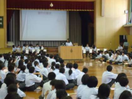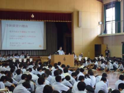 本日の5,6限に体育館で本年度の生徒総会が行われました。本当に暑い中、本部執行部中心に話し合いが行われました。今年の生徒会テーマ『日進月歩ー我らの足で一歩ずつー』のもと、いろいろな活動の取組みができることを期待しています。
