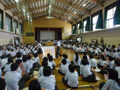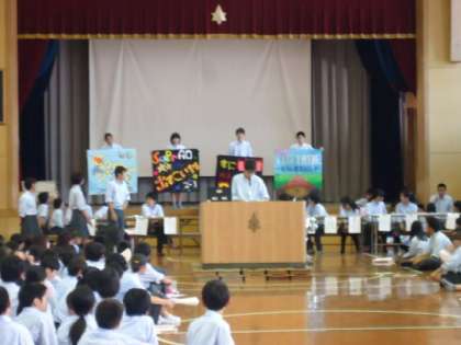 学級旗の発表です。4月後半から各学年で、放課後の時間帯を利用して製作してくれた旗は各クラス立派なものが出来上がりました。