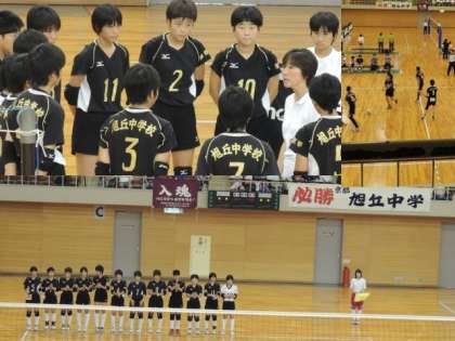 30日に福知山市三段池公園総合体育館で決勝トーナメントが行われました。まず、1回戦は樫原中学校との対戦でした。一進一退の好ゲームとなりましたが、2−0で勝利しました。準決勝は七条中学校でした。なかなかリズムに乗れませんでしたが、ペースをつかみ、2−0で勝利しました。いよいよ決勝戦。市大会と同じ顔合わせの双ヶ丘中との対戦でした。1セットは順調にとりましたが、2セットは逆にペースをつかめず、おとしてしまいました。勝負の3セット目は、リードを許す展開で、23−25であと一歩のところで敗退しました。