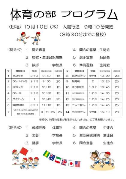 本日、放課後に再度「体育の部」の準備をしてくれました。明日、絶対にいい天気になって素晴らしい「体育の部」が行われると信じています。皆さん、けがのないように頑張ってください!明日は気温もあがる予報です。お茶・タオルを忘れず持ってきてください。