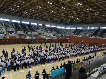本日、府立体育館で合同運動会が行われています。本校の1組も元気に参加しています。開会式の様子です。