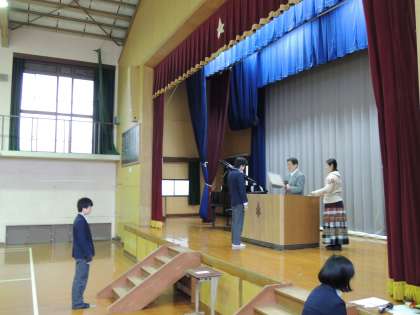 いよいよ、明日、卒業証書授与式が行われます。本日2限に、在校生代表にも出席してもらって、卒業証書授与式の予行が行われました。本番さながらの厳粛な雰囲気の中で行われました。卒業生はそれぞれが思いをこめて予行に臨んでくれたことでしょう。特に、卒業生の歌「友〜旅立ちの時〜」では、たくさんの思い出が走馬燈のように思い出される歌声でした。明日は、もっと思いのこもった合唱が聴けると期待しています。素晴らしい式にしましょう!!