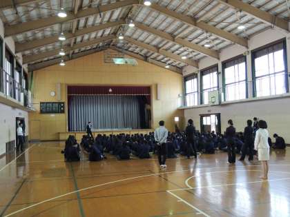 本日、3限に体育館で今年度最初の学年集会が行われました。先生方の紹介やいよいよ来週にせまった沖縄への「宿泊学習会」に向けてなど盛りだくさんで行われました。