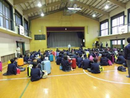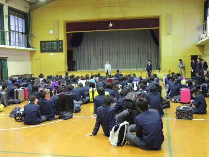 本日より2泊3日の予定で沖縄へ宿泊学習会が実施されます。午前6時に集合の後、体育館で結団式が行われました。素晴らしい宿泊学習会になるようにしてください。